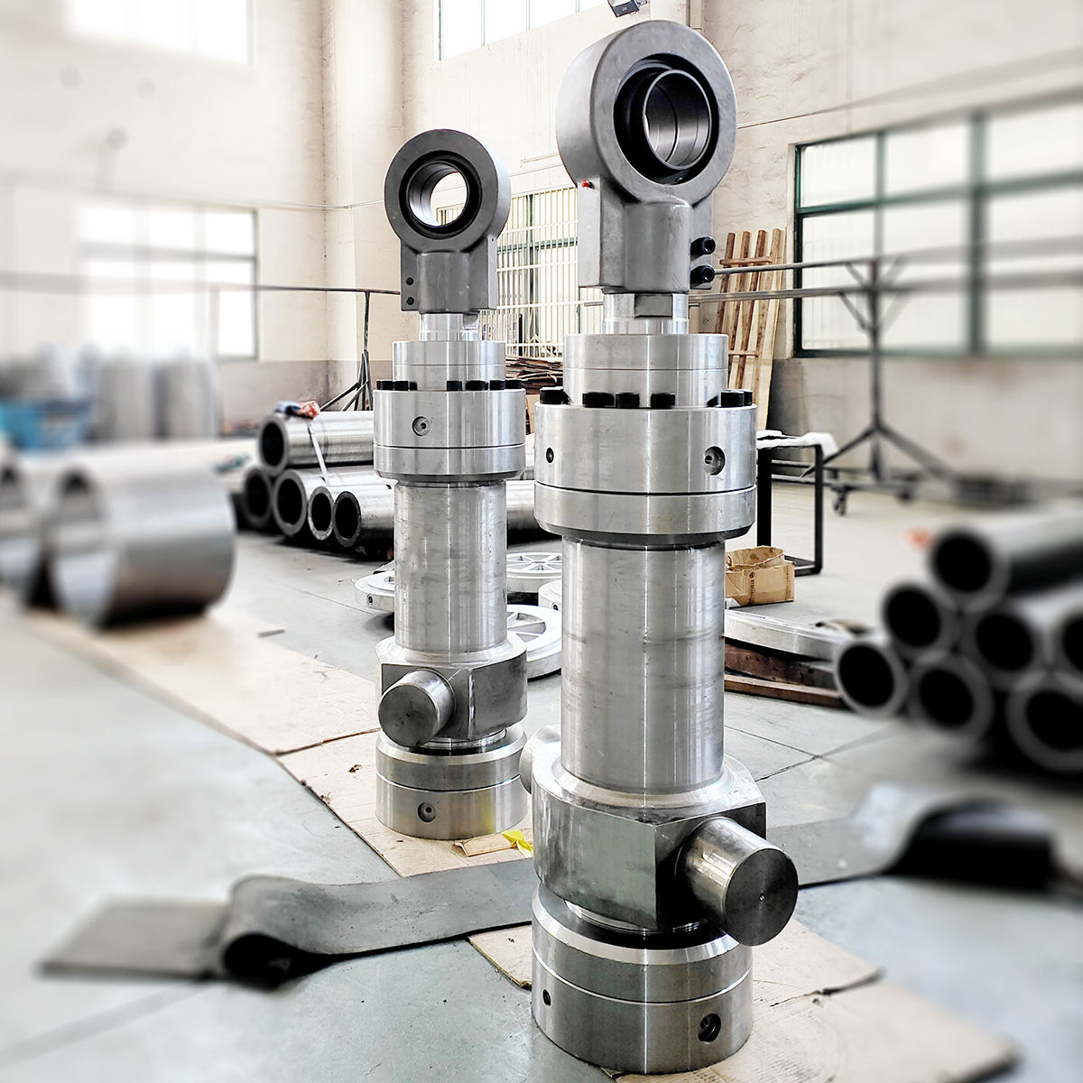 We produce a full range of hydraulic cylinders, including double-acting, single-acting, telescopic, plunger, tie-rod, and welded types. Customization is available with bore sizes from 40 mm to 1200 mm and strokes up to 18 meters.